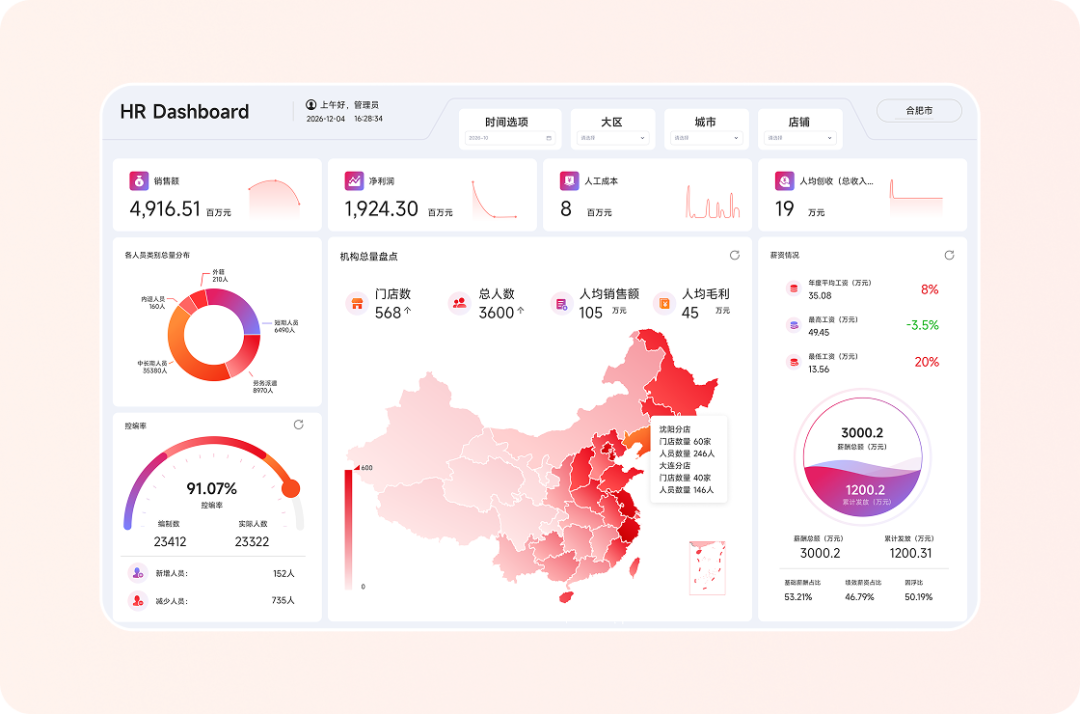 对于需要全局视野的管理层与决策者,管理驾驶舱将最关键的人力经营指标集成在一个高度可视化的界面中。驾驶舱支持自定义大屏模式,视觉风格可按企业品牌进行个性化配置,背景色、主题色、图表样式均可自定义调整,在满足管理汇报场景需要的同时,也能适配董事会展示、经营分析会等正式场合的视觉要求。