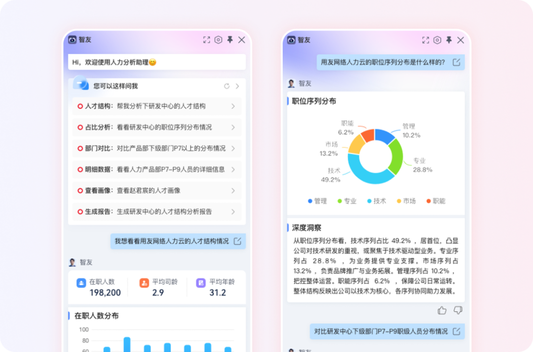当管理者需要直接查看数据分布时,AI同样可以快速响应。在职人员的平均年龄与司龄、年龄结构的分布区间、职位序列的人员占比、职级分布的梯度形态——这些过去需要HR专门下载数据、手动制作图表才能呈现的内容,现在通过对话即可完成。提问的方式,决定了输出的形式;管理者根据当下的判断需求自由选择,系统随之调整响应。