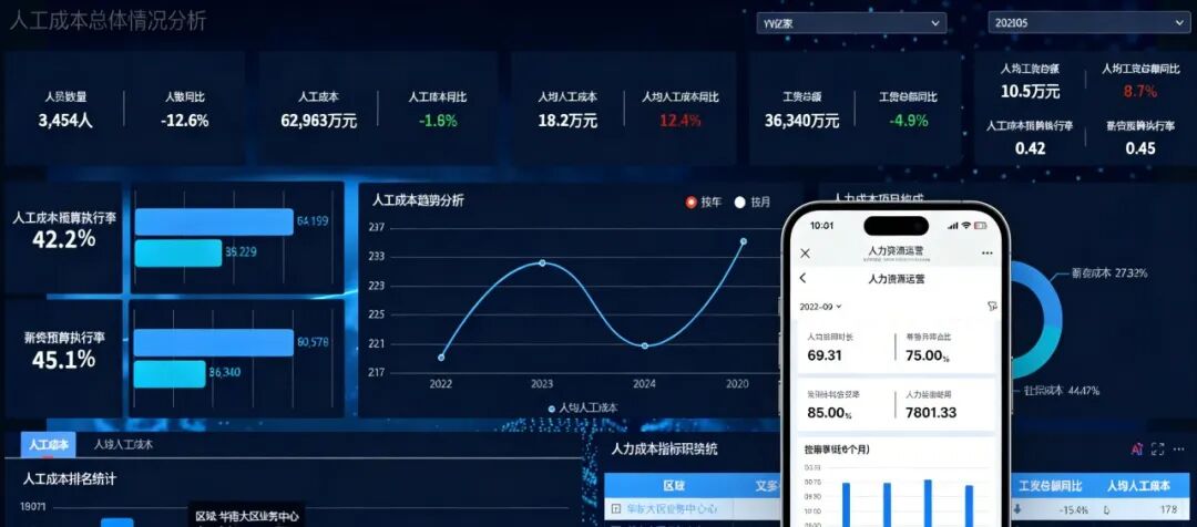 对于需要跨维度分析的业务HRBP,可视化仪表板提供了更直观的数据呈现方式。人均工资总额、薪资预算执行率、人工成本同比变动——这些指标可以通过拖拽字段的方式组合成图表,实时呈现数据趋势与结构分布。图表之间支持数据穿透,点击某一汇总指标可以下钻到部门明细,再进一步下钻到个人层级,让宏观数字背后的细节始终可查可溯。