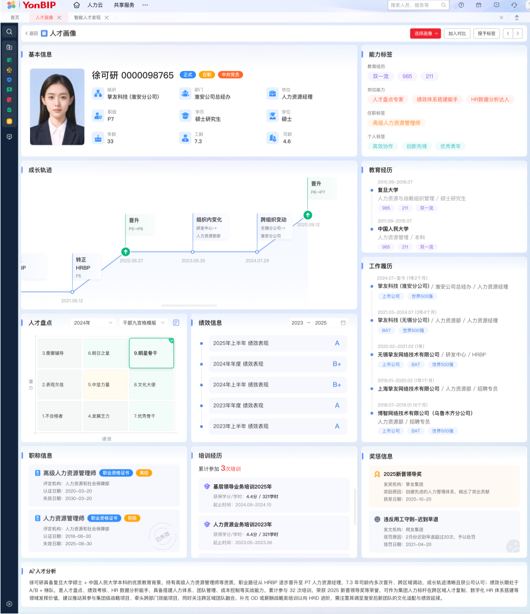 依托YonGPT和人力数据中台,系统将原本散落在各子公司的人力数据整合为统一的分析资产,自动生成人效分析报告、人力成本看板和人才风险预警。