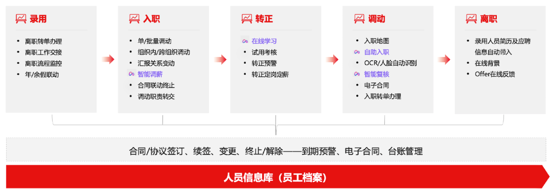 入职环节支持OCR信息采集、电子合同签署,规避纸质档案的管理漏洞;员工每一次岗位异动、薪酬调整、合同续签,系统自动联动更新,确保全链路数据一致。飞检所需的全部人力档案,都可按时间轴溯源,随时调取。